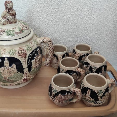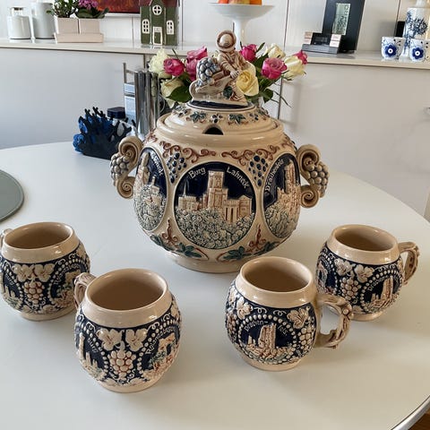 Detaljeret og omhyggeligt dekoreret punchbowle med låg. Mørkeblå baggrundsfarve med elfenbensfarvede og grønne relief dekorationer med Rhin- og Mosel-slotte.(Marksburg, Stoltzenfels, Rheinstein, Ehrenburg, Burg Eltz. og Burg Cochem.)