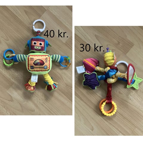 Lamaze - stjerne med spejl og stjerne med smiley, skaktern og stjerner på bagsiden - kan hænge og velcro, så de kan klistres sammen - tryk på smiley så dytter den - 50 kr.