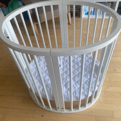 Stokke tremmeseng i rund/oval form. Sengen står på hjul, så den er let at flytte rundt i rummet. Der medfølger hvid sengehimmel, hvid sengekant og madras med quiltet overflade. Velegnet som babyseng i soveværelse eller børneværelse. Sengen kan udvides.