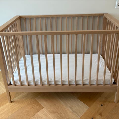 Original madras medfølger til sengen. Betrækket kan tages af og vaskes. Madrassen er stadig rigtig flot, men betrækket har enkelte pletter. Bunden i sengen kan hæves og siden kan fjernes.