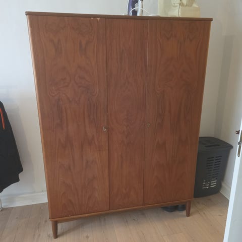 Fint garderobeskab i teak med skuffer, hylder og bøjlestang