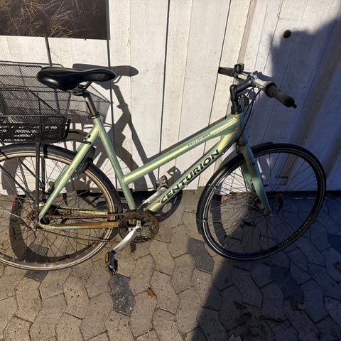Centurion hybridcykel til kvinde med 55 cm stel og 28" hjul. Cyklen har lav indstigning og er egnet til hverdagskørsel og pendling. Farven er lyseblå, og cyklen er udstyret med skærme og baglygten vist på billederne. Hybridgeometrien giver en oprejst og komfortabel kørestilling. Stel og forgaffel er i metal, som ses på billederne. Velegnet til voksenrytter, der passer en stelstørrelse på ca. 55 cm og 28" hjul.