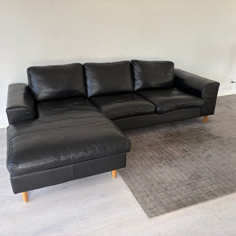 To styks sofaer i sort læder - den ene er højre vendt og den anden venstre vendt