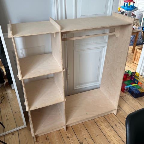børnegarderobe i lyst træ med åben opbevaring. Garderoben har en integreret bøjlestang til ophæng af tøj samt flere åbne hylder i siden til foldet tøj, sko eller legetøj. Konstruktionen er i træfinér med udskårne greb og samlinger. Velegnet til børneværelse eller entré, hvor der er behov for lav og let tilgængelig opbevaring for børn.