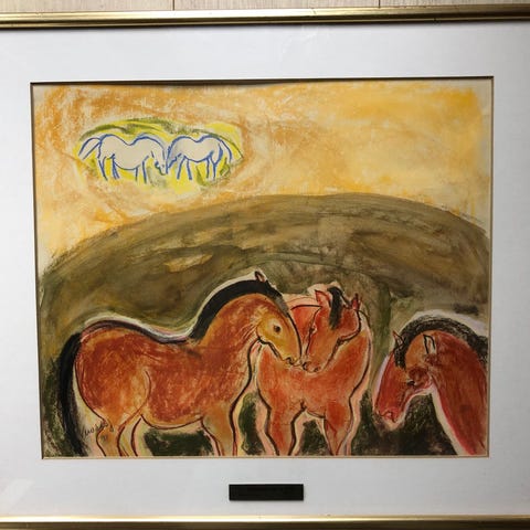 Alfelt er kendt for sine farverige og ekspressive fremstillinger af heste i landskaber.