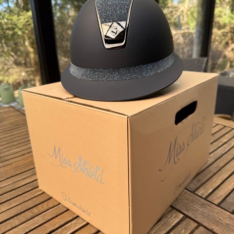 Smuk mat sort Miss Shield ridehjelm hvor top, trim og blazon er mat sort og så er hjelmen med frontbånd i det helt fantastiske sorte ultra fine rock. Ultra fine rock er mere eksklusiv og dyrere end det normale crystal fabric da swarovski krystallerne er størrere og mere glitrende. normal pris i butikker ca 7500kr