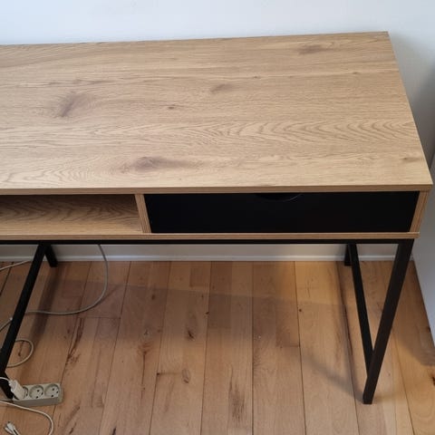 Ilva skrivebord i træ med sort metalstel. Bordpladen fremstår i trælook med synlig årestruktur. Bordet har en åben hylde samt en skuffe med sort front og udskåret greb. Stellet er i sortlakeret metal med lige ben, som giver et let og enkelt udtryk. Velegnet som arbejdsbord eller studieplads i hjemmekontor, stue eller værelse.