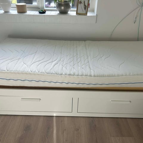IKEA BRIMNES sengestel sovesofa med 2 skuffer i hvid. Sengen har lamelbund og kan trækkes ud til dobbeltseng. God stand.