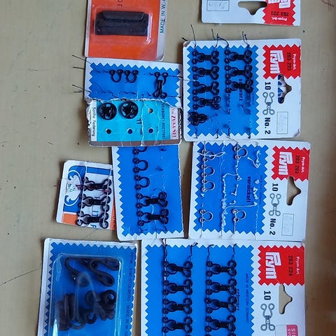 Prym sytilbehør og diverse hobbyartikler blandet lot. Sættet indeholder blandt andet tryklåse, knapper og hægter fra Prym i forskellige størrelser, lap til påsyning, bånd/stropper, nøglering-/rembeslag, mærkater med tekst, strygemærker og applikationer i forskellige motiver samt et ark med små sorte hjerter. Derudover medfølger runde pap- og papirlapper med snor og påskriften "Hand made". Velegnet til syning, reparation, dekoration og forskellige hobby- og DIY-projekter.