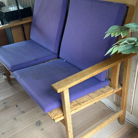 Gammel sofa med mange gode år i sig endnu, men skal have fixet remmene. Vi har den stående i vores sommerhus i Hundested, men har desværre ikke plads til den mere.