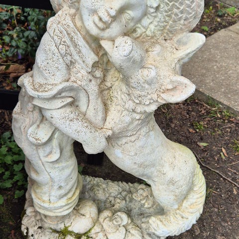 Havefigur udformet som en mand med hat og stok. Figuren er farverigt bemalet med blandt andet brun jakke og røde bukser og står på en fast sokkel. Velegnet som dekoration i have, gårdhave eller ved indgangsparti.
