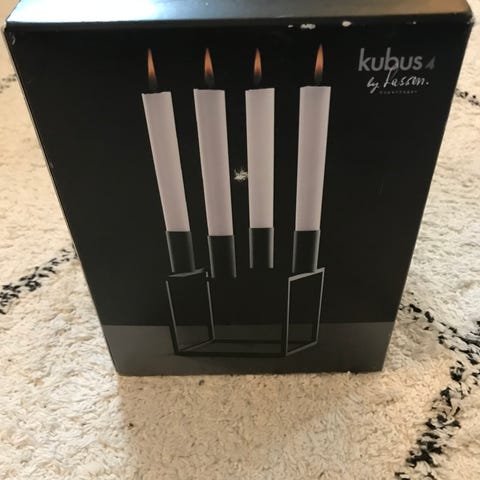 Sælger denne klassiske sorte Kubus 4 lysestage komplet med den tilhørende base, der beskytter bordet mod stearindryp. Den er brugt meget lidt og fremstår i rigtig god stand.