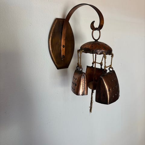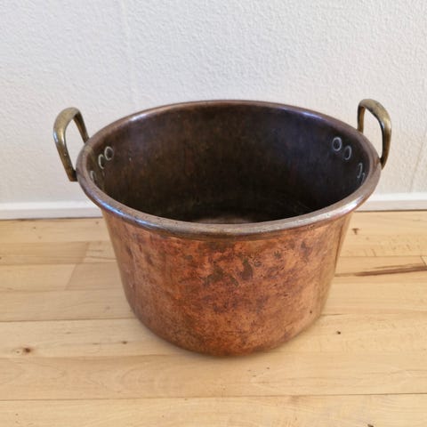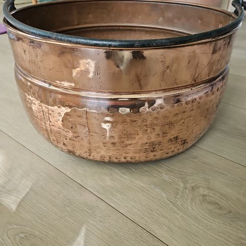 Sættet består af to kobberforme i rund form. Den ene form har præget blomstermotiv på ydersiden og ophængsøje i kanten, så den kan hænges på væggen. Den anden form er glat på ydersiden med lav kant og ligeledes ophængsmulighed. Begge forme har patina på indersiden og er velegnede som dekoration i køkken eller på væg. Størrelser er ikke angivet.