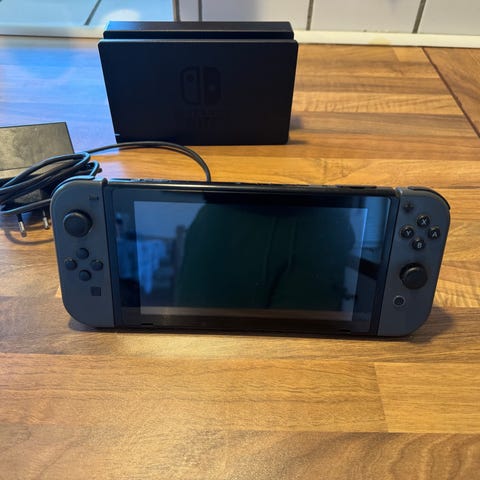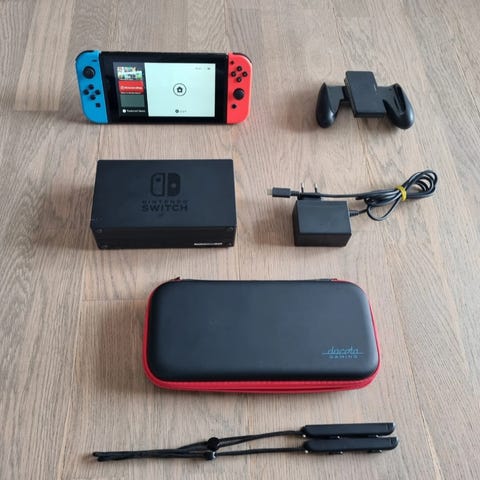 Nintendo Switch konsol med Joy-Con controllere i neon rød og blå. Fremstår yderst velholdt. Sættet omfatter den bærbare konsol med skærm, aftagelige Joy-Con controllere, Nintendo Switch dock til tilslutning til tv, Joy-Con holder, strømforsyning samt et hårdt etui til når gameren skal på tur. Se billeder. God lav pris.