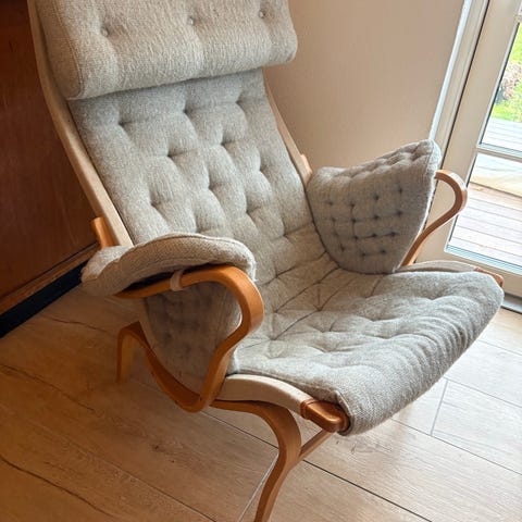 Swedese Bruno Mathsson lænestol med høj ryg og nakkestøtte. Stolen har sort, knapquiltet læderpolstring på sæde, ryg og armlæn samt lyst træstel i bøjet træ. Bagsiden er i lyst tekstil med læderstropper til fastgørelse af hynden. Egnet som komfortabel lænestol i stue eller læsehjørne.