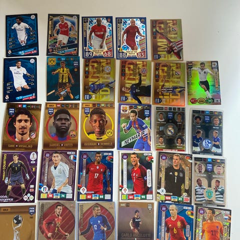 Panini fodboldkort samling med blandede serier og spillere fra forskellige klubber og landshold. Kortene ligger i plastlommer i en mappe. Motiverne omfatter blandt andet spillere i klubdragter og landsholdstrøjer samt forskellige specialkort som limited edition og andre varianter. Velegnet til samlere af Panini fodboldkort, der ønsker en varieret samling med flere typer kort og designs. Nogle af dem er lidt slidte. Men ellers er de i god stand