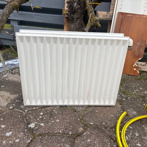 9 radiatorer i forskellige størrelser foræres væg. Man skal selv demontere