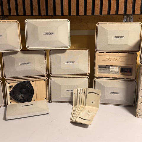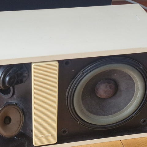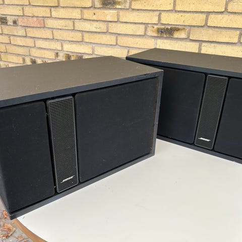 Bose højtaler i rektangulært kabinet med frontgitter og panel i lys farve. Kabinettet er overvejende hvidt med mørk bagside, hvor tilslutninger og mærkat er placeret. Velegnet som del af et hjemme- eller stueanlæg, hvor der ønskes en enkeltstående højtaler med klassisk design.