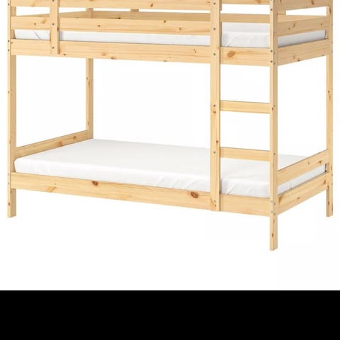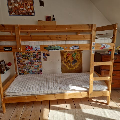 IKEA køjeseng i træ. Køjesengen er udført i massivt træ med synlige knaster og samlinger med bolte. Den består af to senge placeret oven på hinanden med stige integreret i konstruktionen. Egnet til børneværelse eller gæstepladser, hvor der ønskes to sovepladser på begrænset plads. Sengen fremstår med almindelige brugsspor på trærammen. Madrasser og tekstiler på billederne kan være illustrative og er ikke nødvendigvis inkluderet.