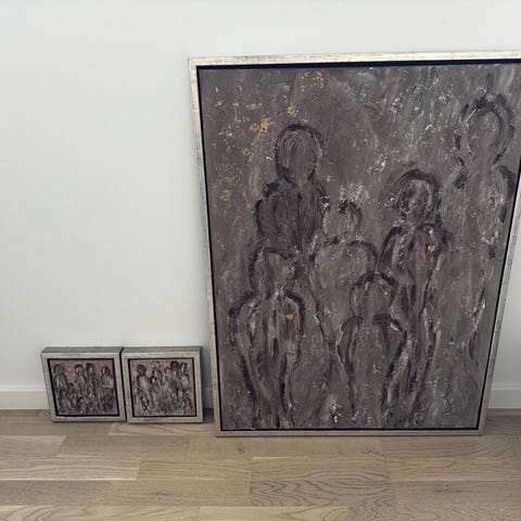 Maleri med figurativt motiv af en stående person. Billedet er udført i en ekspressiv stil med dominerende nuancer af grå, sort, orange og gul. Maleriet er indrammet i en smal ramme. Velegnet som vægdekoration i stue, gang eller andre opholdsrum. 35-70 cm. Sender.