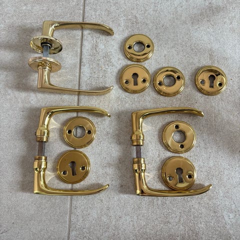 Dørgreb og rosetter i messing. Sættet omfatter flere sæt dørhåndtag med tilhørende nøgleskilte og skruer. Egnet til indvendige døre, hvor der ønskes et klassisk udtryk med messingbeslag.