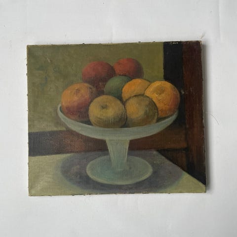 Maleri med stillebenmotiv forestillende en træstol med kande, vase og citron. Farveholdningen er overvejende brun, blå, grå og gul med markante, brede penselstrøg i en mere abstrakt stil. Maleriet er indrammet i en profileret ramme.