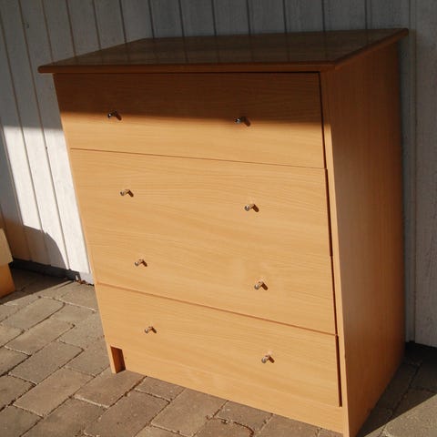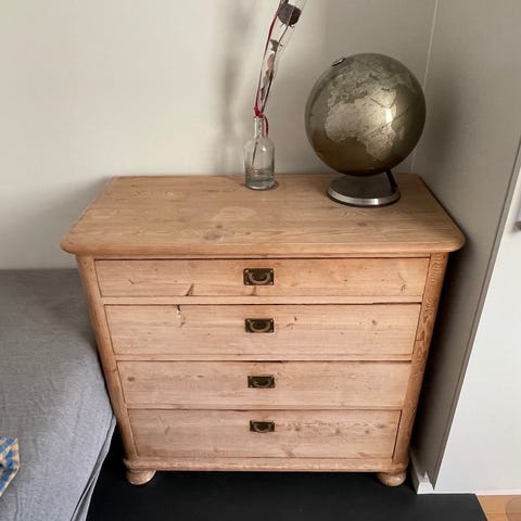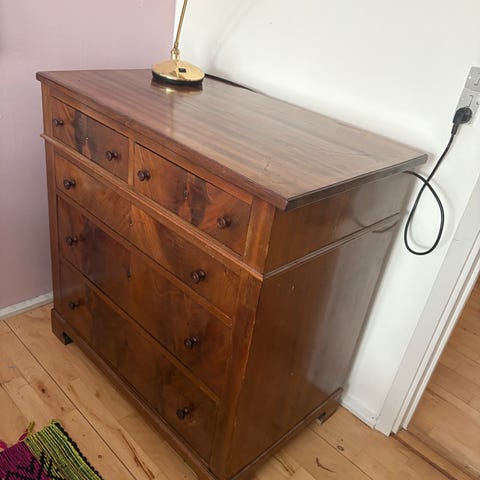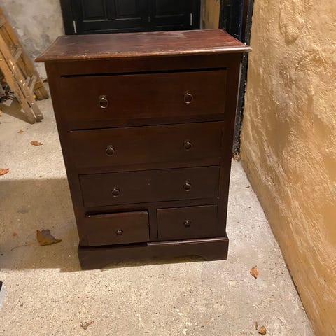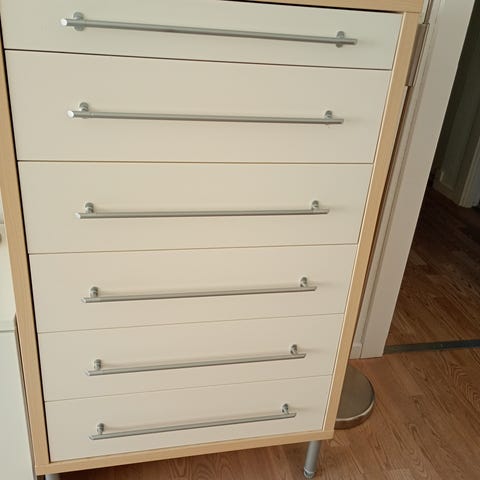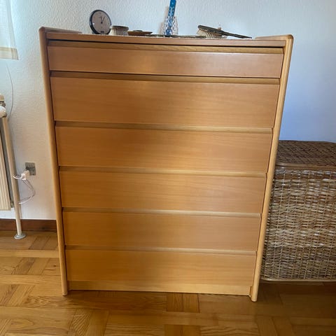 Kommode i mørkt træ, med 6 brede og dybe skuffer.