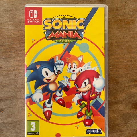 Sega Sonic Mania Plus Nintendo Switch spil. Fysisk udgave til Nintendo Switch med spilboks og omslag. Spillet er PEGI 3 og indeholder klassisk 2D platformspil med figurer som Sonic, Tails og Knuckles. Velegnet til Nintendo Switch konsoller, der understøtter fysiske spilkartridger.