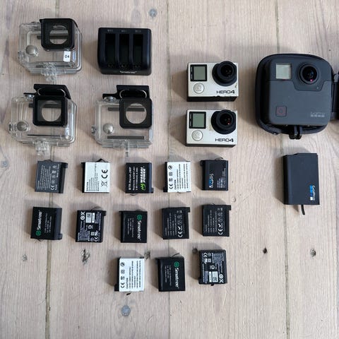 GoPro actionkamera med omfattende tilbehørssæt. Sættet omfatter actionkamera, flere batterier, forskellige monteringsbeslag, håndgreb, stativer og etui til opbevaring. Der medfølger desuden et FALCON 3-aksers gimbal-stabilisatorhåndtag samt et Slik U8000 stativ, som kan anvendes til mere stabil optagelse. Velegnet til video- og fotooptagelse i forskellige situationer, hvor der er behov for et kompakt actionkamera med fleksible monteringsmuligheder.