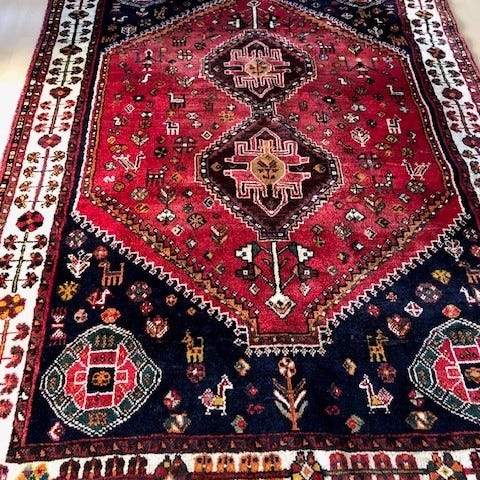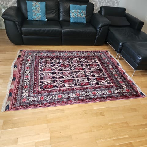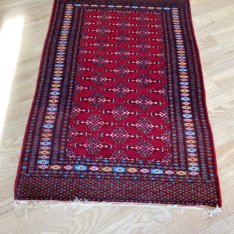 Ægte tæppe med orientalsk inspireret mønster i røde, mørkeblå og beige nuancer. Tæppet har et detaljeret, geometrisk mønster langs midterfeltet og en mønstret bort hele vejen rundt. Enderne er afsluttet med korte frynser. Egnet som gulvtæppe i stue, entré eller andre opholdsrum. Materiale og præcise mål er ikke oplyst.