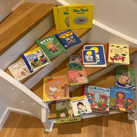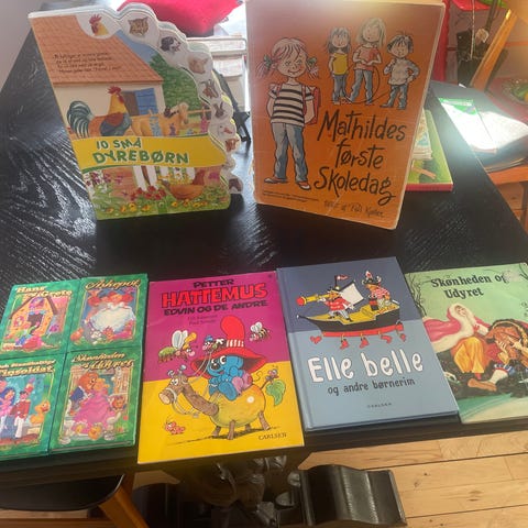 Samling af børnebøger med blandede titler. Bøgerne har farverige illustrationer og er velegnede til højtlæsning eller selvstændig læsning for børn. Forskellige historier og temaer er repræsenteret i samlingen. Antal og specifikke titler fremgår af billedet.