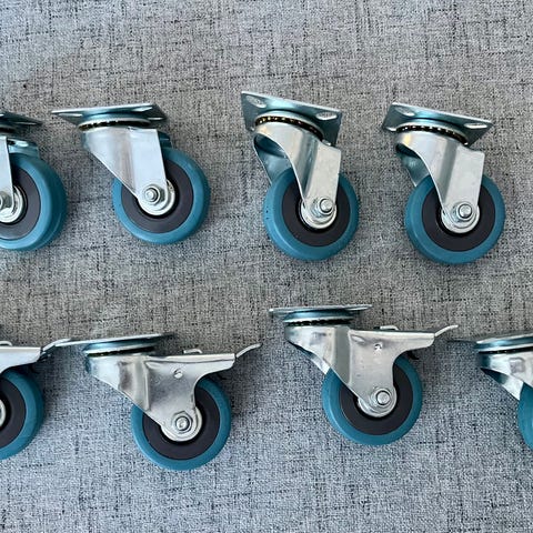 Ubrugte. Dia: 75 mm, totalhøjde: 10 cm. Perfekte til små møbler du gerne vil kunne flytte.