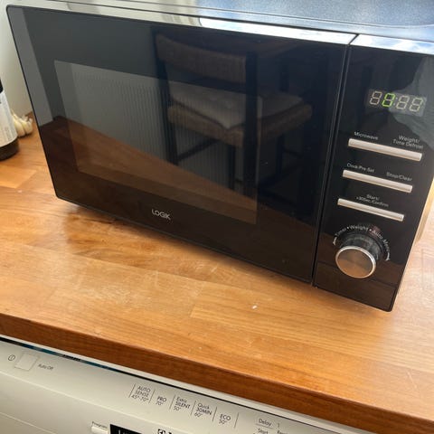 Logik mikrobølgeovn i hvid. Standard fritstående model med frontlåge og betjeningspanel med drejeknapper og display. Indvendigt er der glasdrejetallerken. Egnet til almindelig opvarmning og optøning af mad i køkkenet.