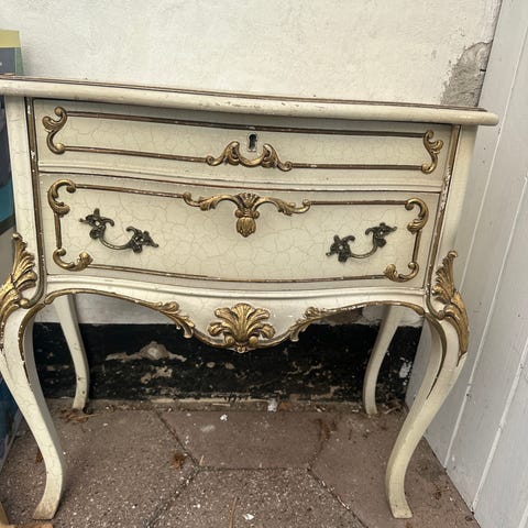 Rigtig sødt gammelt bord, entremøbel eller vasketøjskurv. Har afskalning i malingen på forsiden - se billede. Er ikke ret tungt. Er 81 cm højt, 61 cm bredt og 30 cm dybt i midten. Sendes ikke, men kan hentes på adressen.