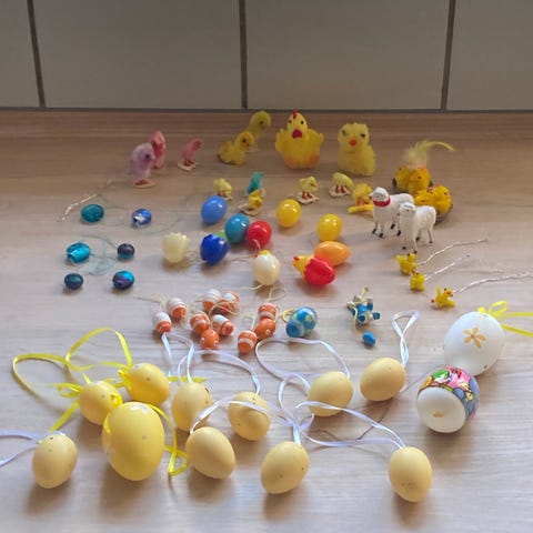 En blandet portion retro påskepynt. Det ene æg mangler lidt maling, og mange æg mangler deres snor. Ellers er det i pæn stand.