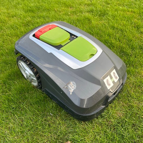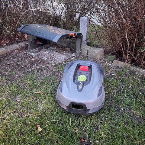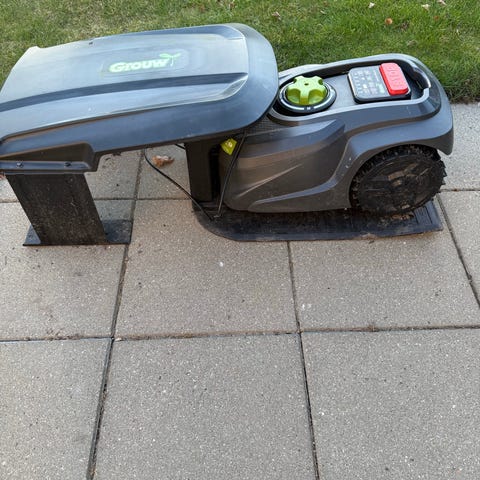 Grouw robotplæneklipper med tilhørende ladestation. Robotplæneklipperen har betjeningspanel med display, numerisk tastatur og start/stop-knapper under et beskyttende låg. Ladestationen har tilslutningskabler til strømforsyning og tilslutning af afgrænsningskabel i haven. Velegnet til automatisk klipning af græsplæne inden for et afgrænset område, hvor robotten selv vender tilbage til ladestationen for opladning. Robotplæneklipper til 500 m2, giv et bud