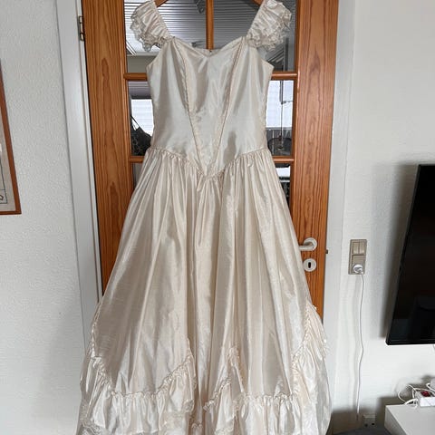 Lilly brude kjole til dame i str. 44. Kjolen er hvid og fremstillet i polyester. Modellen har korte ærmer, lang længde og dekorative sløjfedetaljer foran. Egnet som fest- eller selskabskjole.