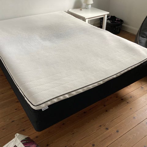 Jysk seng med madras i sort betræk. Sengen står på metalben og har et enkelt, rektangulært design. Måler 140*200. Sælges uden topmadras.