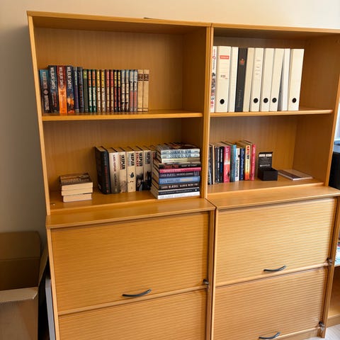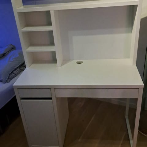 Sælger dette praktiske skrivebord med integreret reol/skab i hvid og trælook.