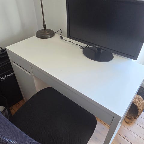 Perfekt til hjemmekontor, studie eller gaming-setup. Bordet har god bordplads, en stor skuffe samt masser af opbevaringsplads i reolen.