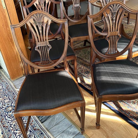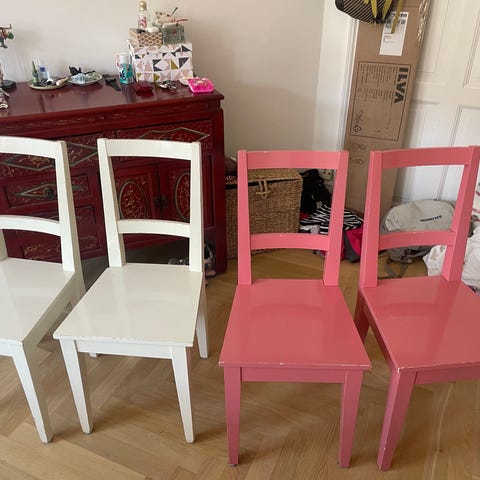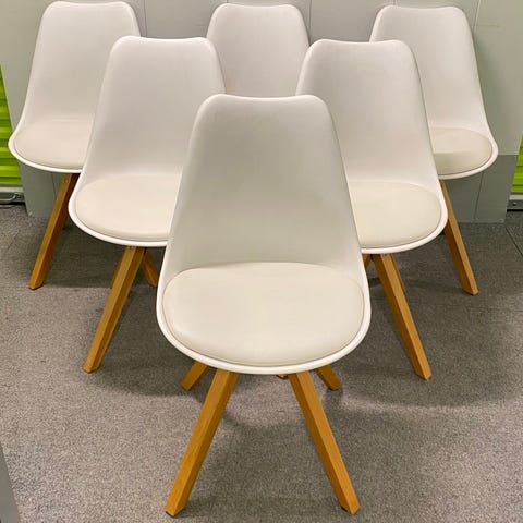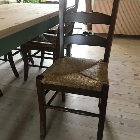 6 spisebordsstole, som er brugt men i nogenlunde stand. Der er en stol med nogen pletter fra maling (ses på billedet). Og en anden stol hvor selve stolen sidder en anelse løs på benene.