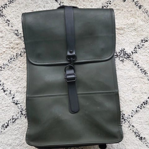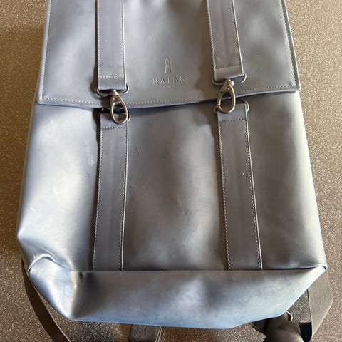 Rolltop Rucksack fra det danske mærke Rains. Den er kendt for sit minimalistiske design og er fremstillet i mærkets karakteristiske vandtætte PU-materiale.
