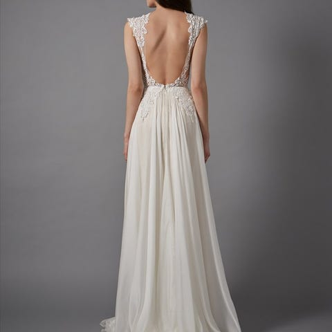 og fremstillet i polyester. Modellen har lang, vid nederdel og ærmer i blondelook.
