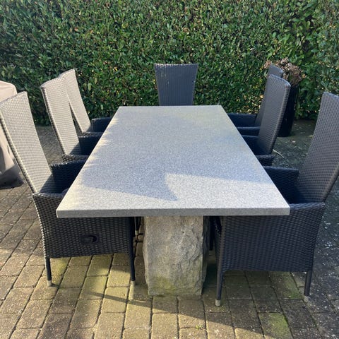 Eksklusivt havebord til 7-8 personer med galvaniseret stel og 3 polerede granitplader. 220x100x74 cm. Står som nyt. Det forgår aldrig og kræver ikke vedligeholdelse.