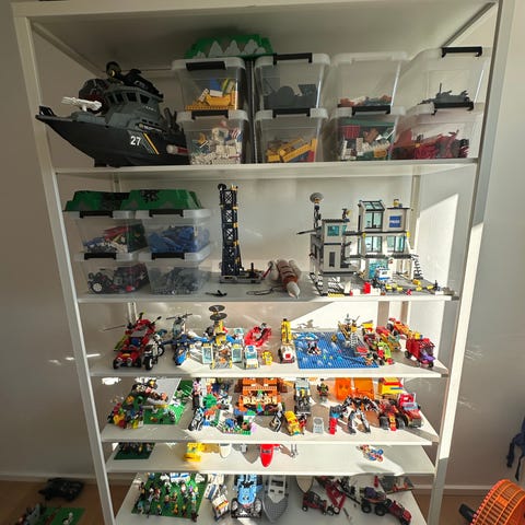 Reolen har flere rum og gode opbevaringsmuligheder. Den er brugt og har synlige mærker, ridser og almindeligt slid (se billeder), men er stadig stabil og fuldt funktionel.