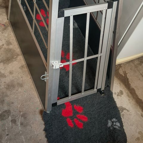 Transportbur med mulighed for forskellige åbninger og fastspændelse til bagegerum. Stort set ikke brugt, da vores hund ikke rigtig kan lide at køre