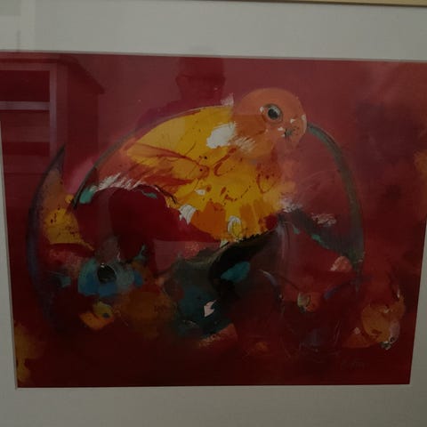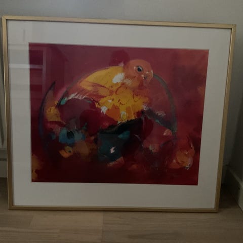 Christian Friis original fuglemotiv. Motivet indrammet med lys passepartout og smal, guld ramme.
