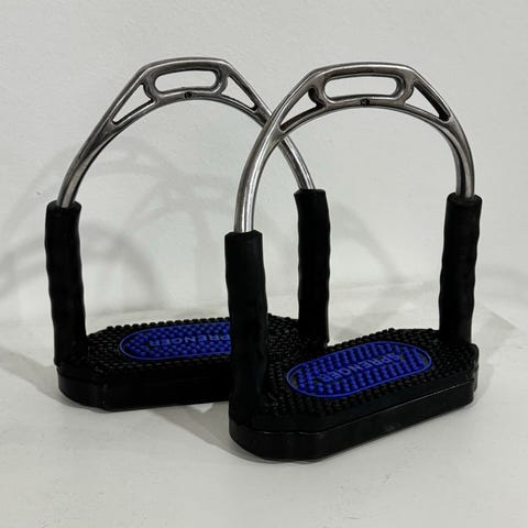 “Sikkerhedsstigbøjler fra Herman Sprenger. Designet i det patenterede Bow Balance, der som med System 4 er bevægelig i fire retninger, hvilket mindsker risikoen for at foden kan sidde fast i bøjlen betydeligt. Derudover er bøjlen skabt i en bue, der sikrer bedre benstilling for rytteren, og den brede trædeflade sikrer komfort. Den fleksible og stødabsorberende bøjle mindsker samtidig belastningen af knæ og ankler, og kan derfor med fordel anvendes af ryttere med fx knæskader.