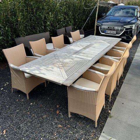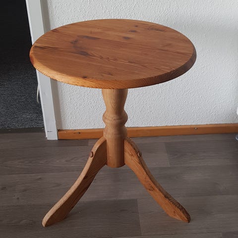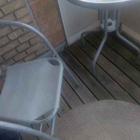 Jeg har et bord og to stole, som er blevet brugt til altanen. Da det er af træ har det kun stået udenfor i sommerhalvåret. Sættet er ca. 2 1/2 år gammelt, men er i ganske fin stand.