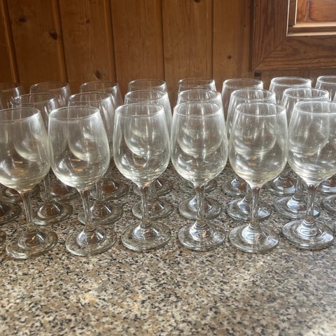 Jeg har fundet disse glas i en kasse på loftet. Der er 10 af de små, 3 af de mellemstore og 2 af de store. Jeg mener at det er royal leerdam Ambassador glas men jeg kan ikke huske hvor de kommer fra. Kan potentielt leveres efter aftale I Odense området. Sælges samlet for 250 kr.